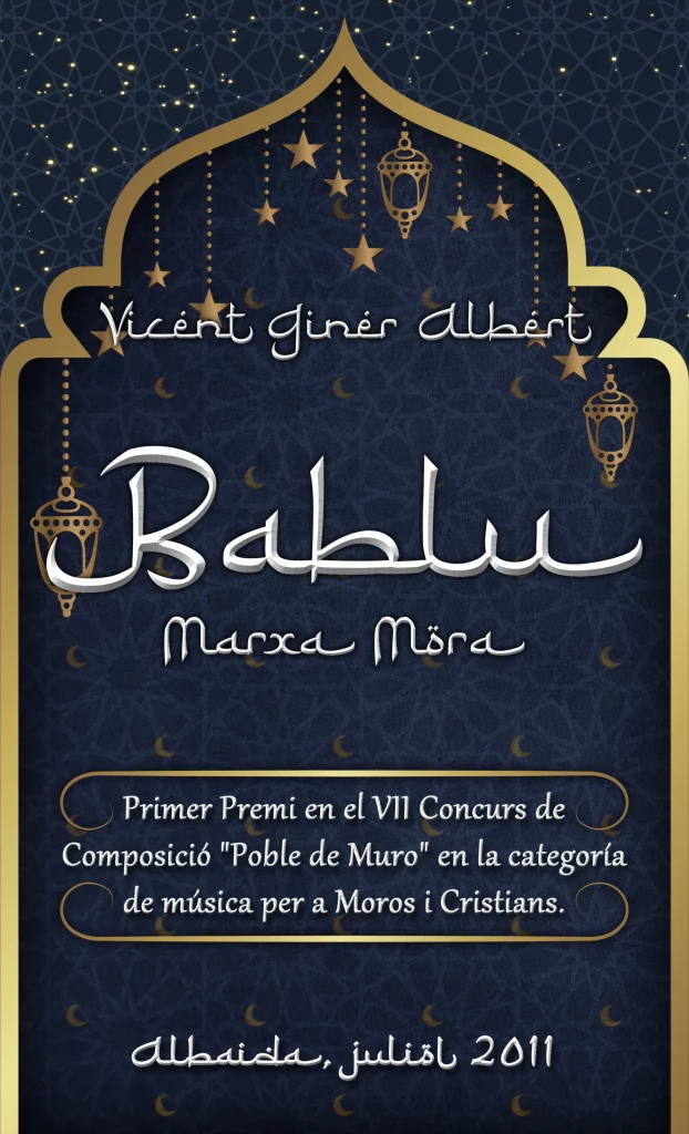 MARCHA MORA [4′] Dulz. 1/2/3 – Perc. 1/2/3/4 (2012) PRIMER PREMIO EN EL «VII CONCURS DE COMPOSICIÓ PER A DOLÇAINES I PERCUSSIÓ -POBLE DE MURO-” EN LA ESPECIALIDAD DE «MÚSICA PER A LA FESTA DE MOROS I CRISTIANS» «Dedicada a Pablo Ruiz Pastor. Per a que aquesta música mantinga per sempre la flama de la nostra amistat» Estreno y grabación realizada en directo en el concierto del concurso el año 2012. Director: Mario Roig VilaEnsamble: Grup de dolçainers i tabaleters «La Xafigà» de Muro d’Alcoi DEMO PARTITURA ¿Quieres recibir el material completo?Ponte en contacto conmigo: