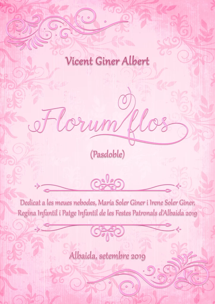 PASODOBLE PARA BANDA [6′] (2019) «Dedicat a les meues nebodes, María Soler Giner i Irene Soler Giner, Regina Infantil i Patge Infantil de les Festes Patronals d’Albaida 2019» DEMO PARTITURA ¿Quieres recibir el material completo?Ponte en contacto conmigo: