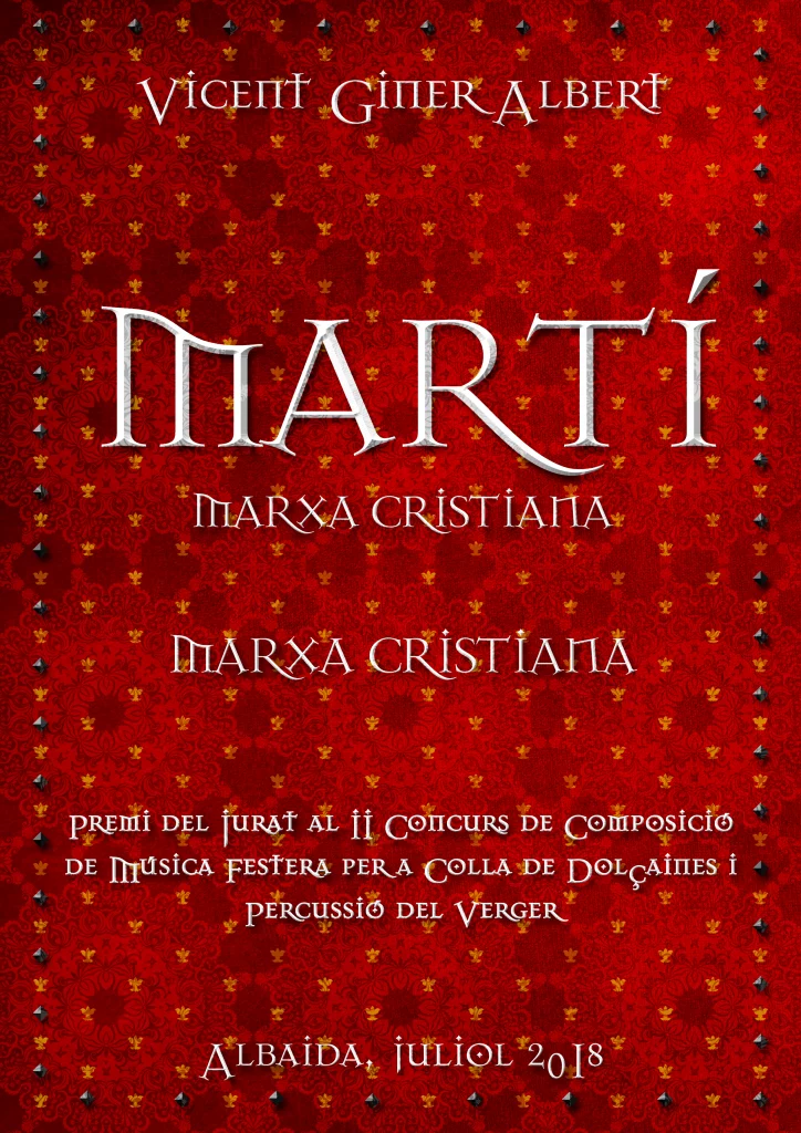 MARCHA CRISTIANA [4′] Dulz. 1/2/3 – Perc. 1/2/3/4/5 (2018) PREMIO DEL JURADO EN EL «II CONCURS DE COMPOSICIÓ DE MÚSICA FESTERA PER A COLLA DE DOLÇAINES I PERCUSSIÓ DEL VERGER 2018” Obra presentada bajo el lema «PHOENIX» y rebautizada según las bases del concurso por el Consejo Moro y Cristiano del Verger con el nombre de «MARTÍ», en honor a Martí Guixot Sendra. Estreno y grabación realizada en directo en el concierto del concurso el año 2018. Director: Pere VicaletEnsamble: Grup de dolçainers i tabaleters de l’Espai de Música Jove del Verger DEMO PARTITURA ¿Quieres recibir el material completo?Ponte en contacto conmigo: