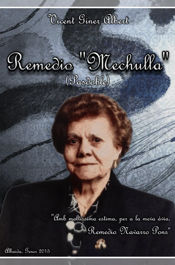 PASODOBLE PARA BANDA [4′] (2015) «Dedicado de manera póstuma a mi abuela, Remedio Navarro Pons» Grabación realizada en directo en en la entrada de bandas de Onteniente del año 2015. Director: Vicent Giner AlbertBanda: Asociación Cultural «Grup Musical d’Albaida» (A.C.G.M.A)